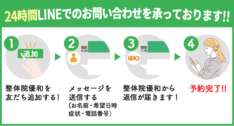 ※緊急性が高い重篤な症状で、施術を行わない方が良いと判断した場合は、医療機関への通院をおすすめする場合がございます。