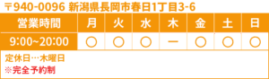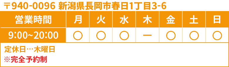 | 営業時間 | 9:00~20:00 ※完全予約制 |